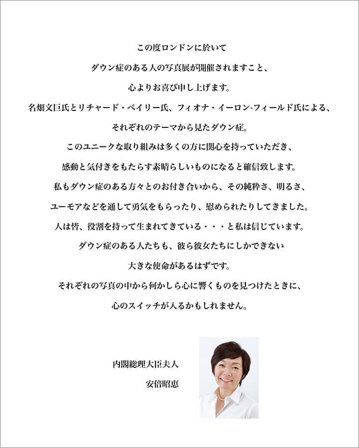 「日曜日に東京からニューヨークに到着以来、私は毎日国連本部を訪れており、そこで名畑さんの写真展を見る素晴らしい機会に恵まれました。大変美しい写真です。希望を持って成長する障害のある子どもたちの写真に、私はすべての子どもたちが持っている感動的なエネルギーを思い起こしました。子どもたちに会うといつも力をもらっていると感じます。それが私が理事長を務めている、ろう児学校の明晴学園の仕事の原動力となっています。」
