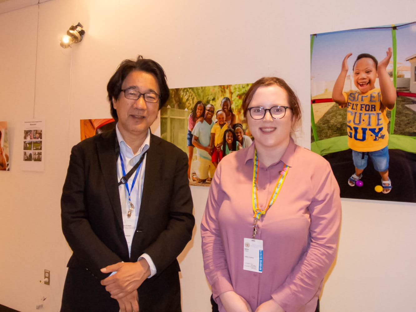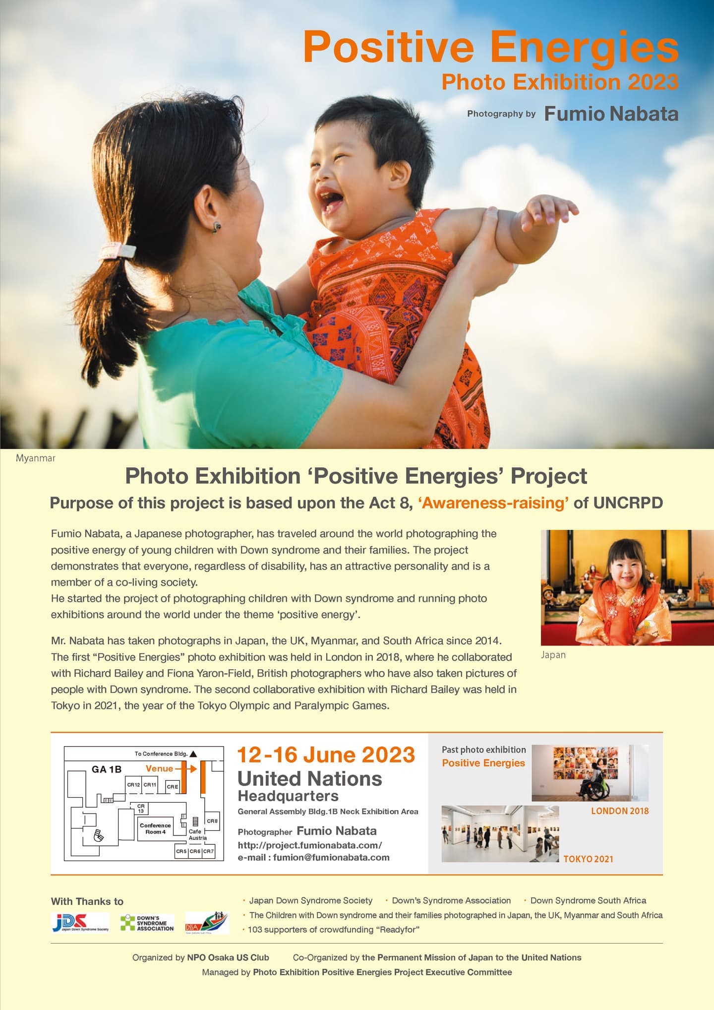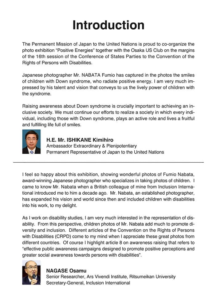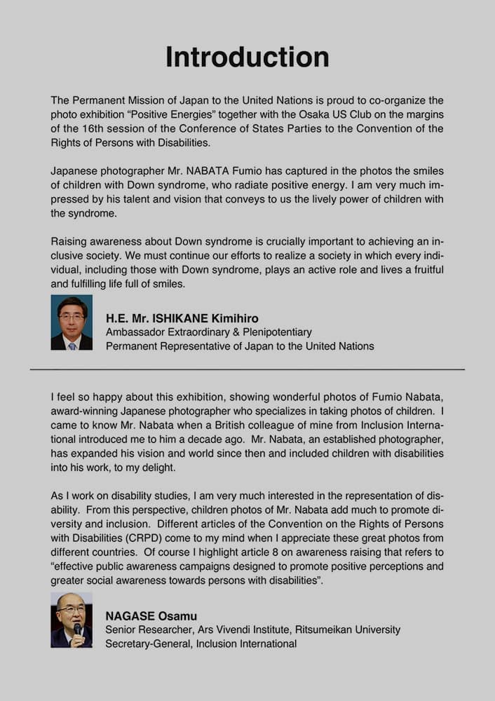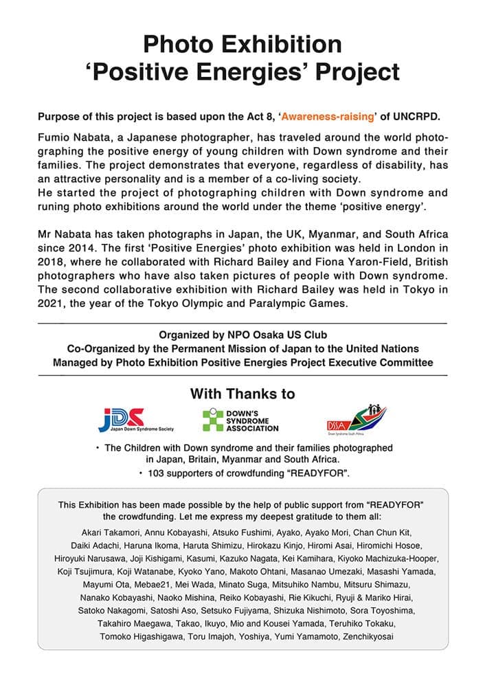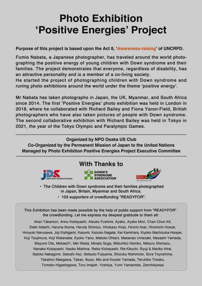 写真家名畑文巨による世界のダウン症のある子どもたちとその家族のポジティブな生きるエネルギーにあふれた作品を展示する写真展ポジティブエナジーズを国連本部での開催しました。この写真展プロジェクトはロンドン展、東京展に続く第3回写真展で、6月12日〜15日に開かれる第16回障害者権利条約締約国会議※(COSP16)に合わせて実施しました。写真展ポジティブ エナジーズは、この条約の第8条 意識の向上【障害者に関する社会全体(各家庭を含む。)の意識を向上させ、並びに障害者の権利及び尊厳に対する尊重を育成すること。】を目的の根幹とし、前向きなエネルギーに溢れた作品の展示により、人々に希望を与え、障害に対する偏見をなくすことを目指しています。