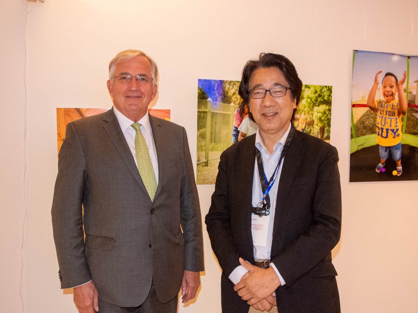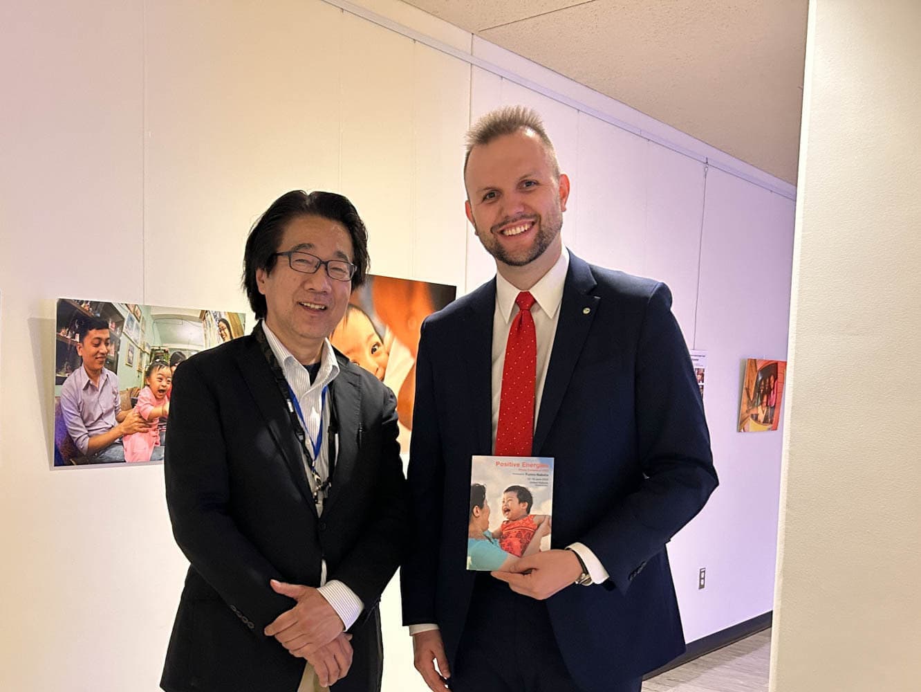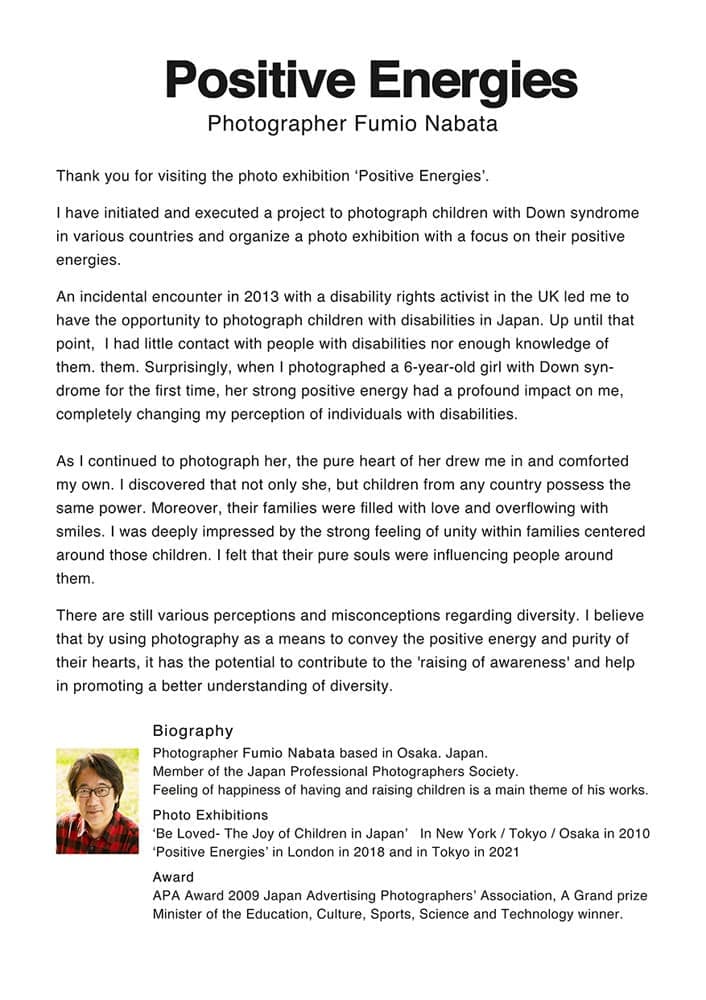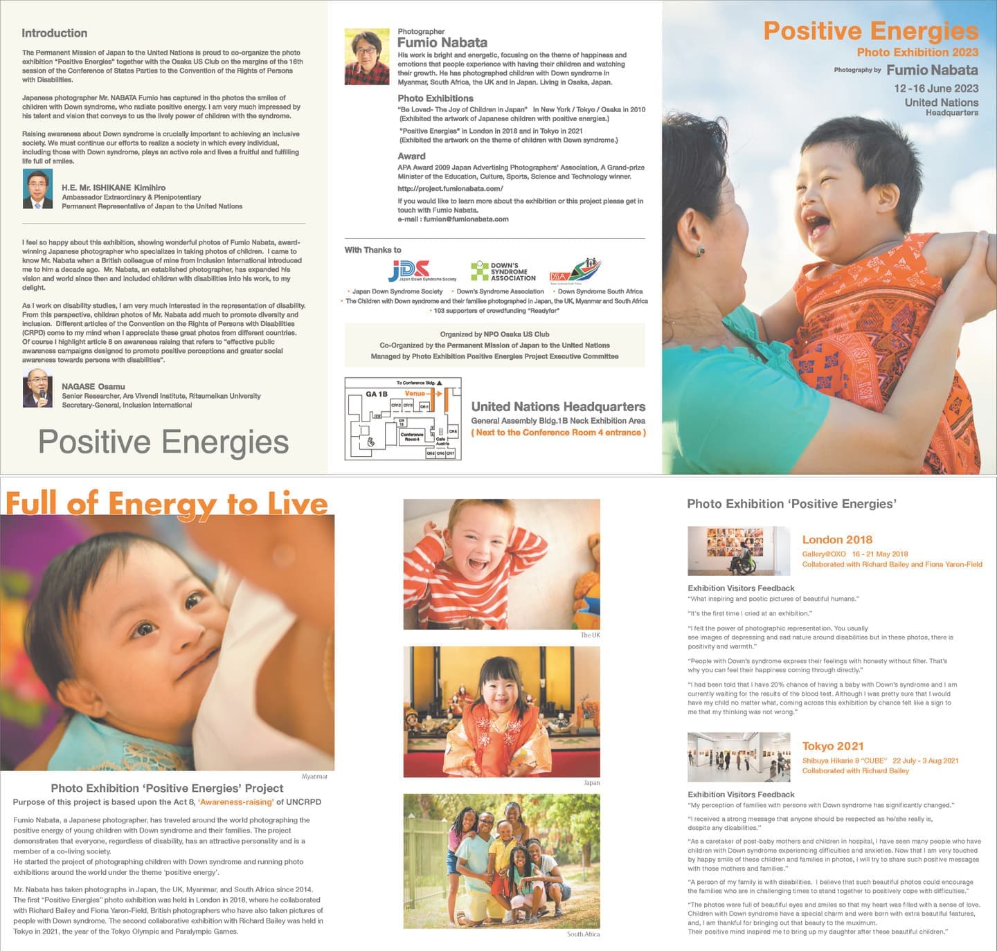 写真家名畑文巨による世界のダウン症のある子どもたちとその家族のポジティブな生きるエネルギーにあふれた作品を展示する写真展ポジティブエナジーズを国連本部での開催しました。この写真展プロジェクトはロンドン展、東京展に続く第3回写真展で、6月12日〜15日に開かれる第16回障害者権利条約締約国会議※(COSP16)に合わせて実施しました。写真展ポジティブ エナジーズは、この条約の第8条 意識の向上【障害者に関する社会全体(各家庭を含む。)の意識を向上させ、並びに障害者の権利及び尊厳に対する尊重を育成すること。】を目的の根幹とし、前向きなエネルギーに溢れた作品の展示により、人々に希望を与え、障害に対する偏見をなくすことを目指しています。