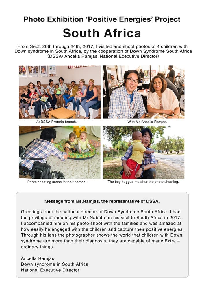 「素敵な写真ですね。私は、ダウン症の女の子を一人我が娘として養子にし、障害児と関わる仕事をしています。ナミビアにもPositive Energiesプロジェクトに似たものがあります。ぜひナミビアにも来てください。」