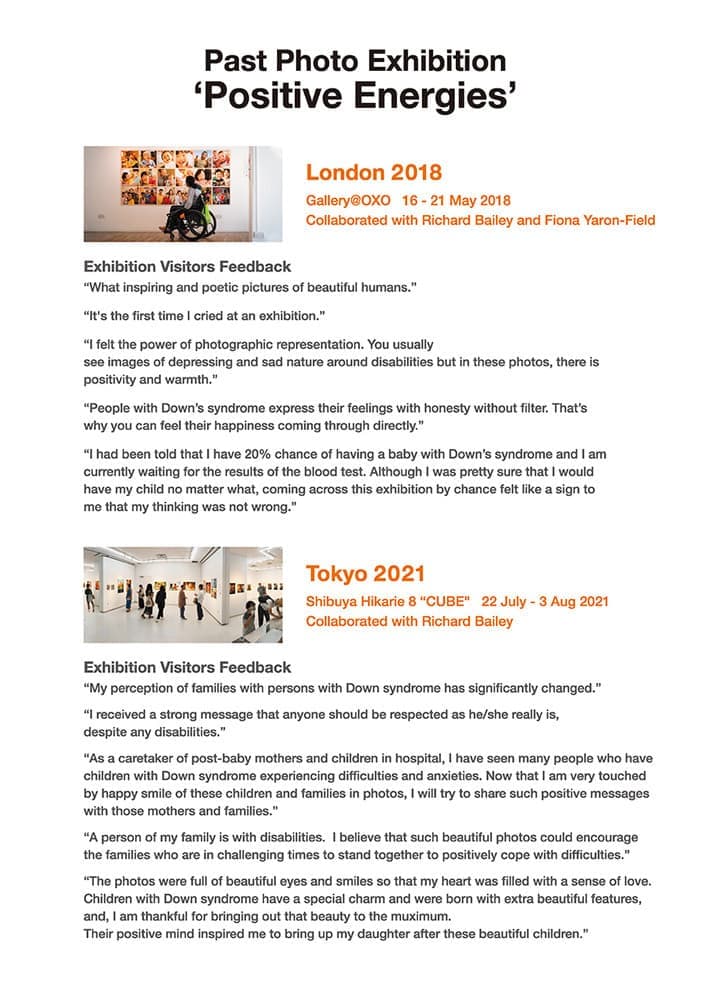 “Pictures speak louder than words and I am very pleased to have seen you Positive Energies exhibition and how you were able to capture the beauty and joy in those young faces. In my mother tongue we call the Down kids ‘Hemelkinders’ which means ‘Kids from Heaven’ because God’s nature is reflected in them.